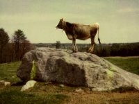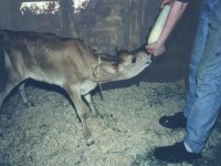 This is a picture of a calf being bottle fed. A cow has four stomach. The bottle has to be positioned correctly so the milk will go into the right stomach. The calf will get sick if you don't feed it correctly.