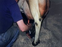 This is a picture of Leta putting a milking machine on a cow. This has to be done carefully to avoid air leaks that can give the cow mastitis.