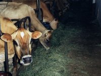 This is a picture of cows in their stanchions eating hay out of the crib. Cows gulp down their hay very quickly. Later they lie down and bring it back up to chew it properly. This is called chewing the cud.